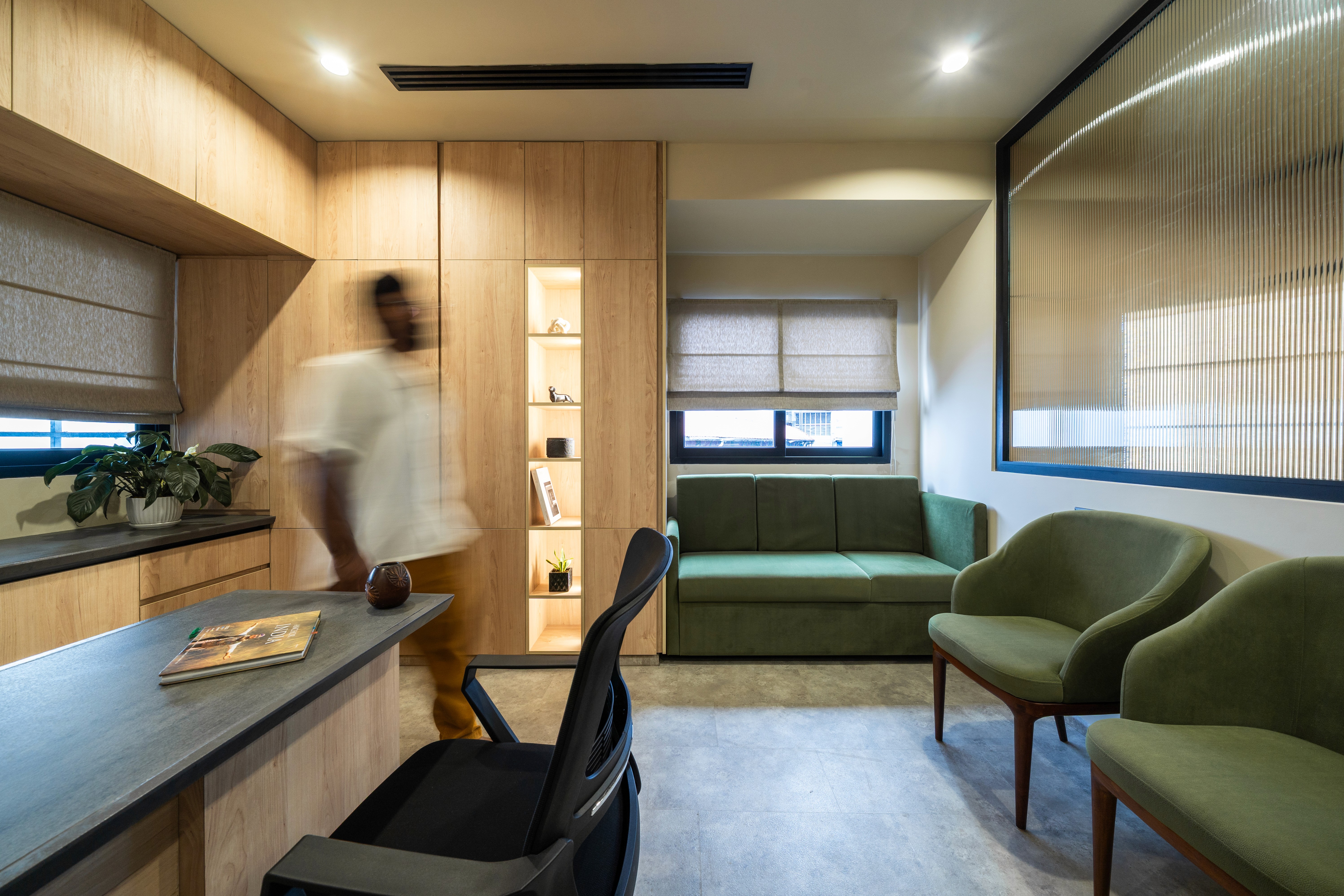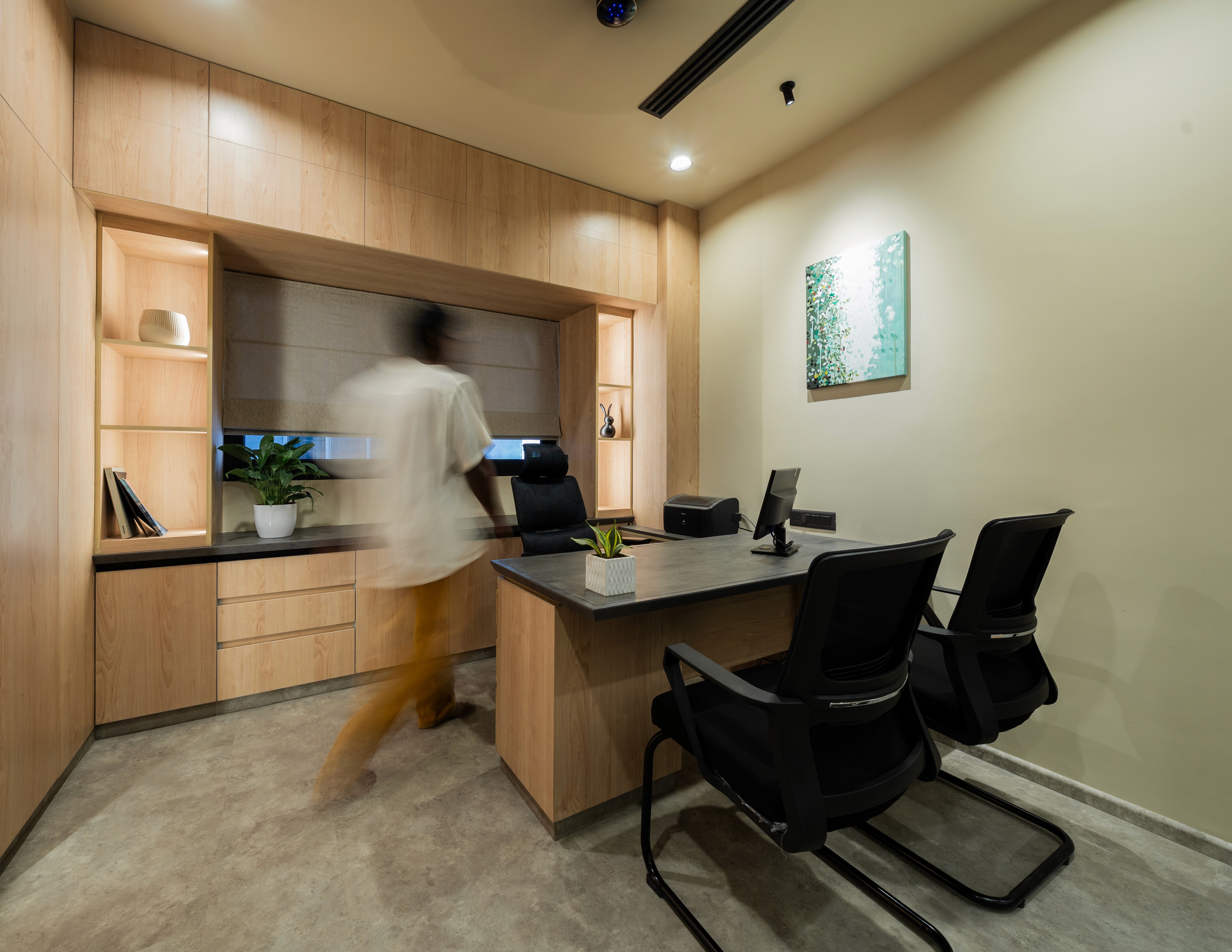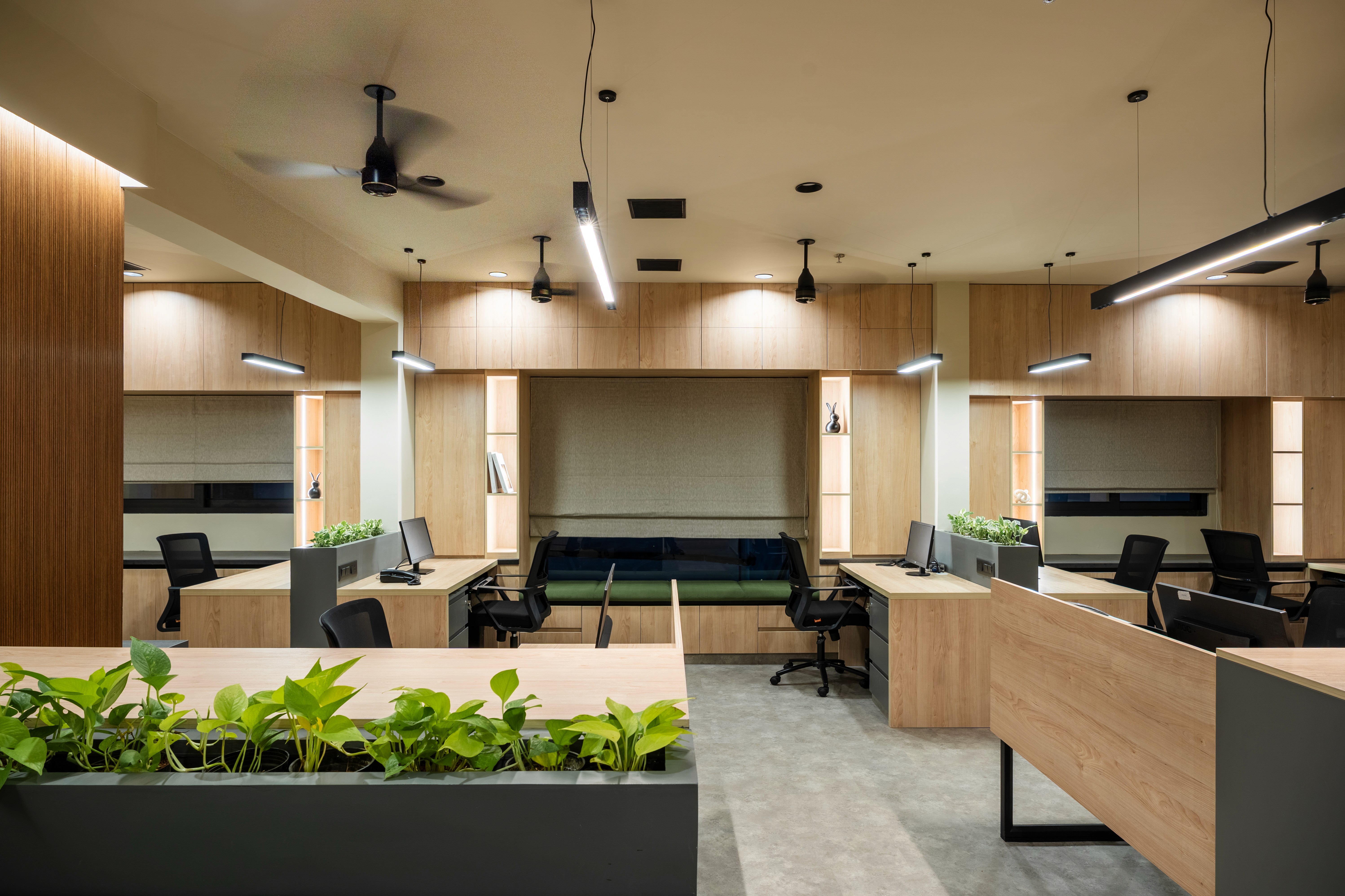 Renovation of administrative floor, is designed in Japandi style- influenced by the ancient Japanese philosophy of wabi-sabi, a way of life which values contentment and simplicity, as well as the Scandinavian practice of hygge, which embraces comfort, cosiness and wellbeing. We have brought in these principles and ideologies by reflecting the same in furniture, artworks and color palettes in the interior. Altering the spatial planning to optimise space and increase productivity of individuals was the key factor in this project.