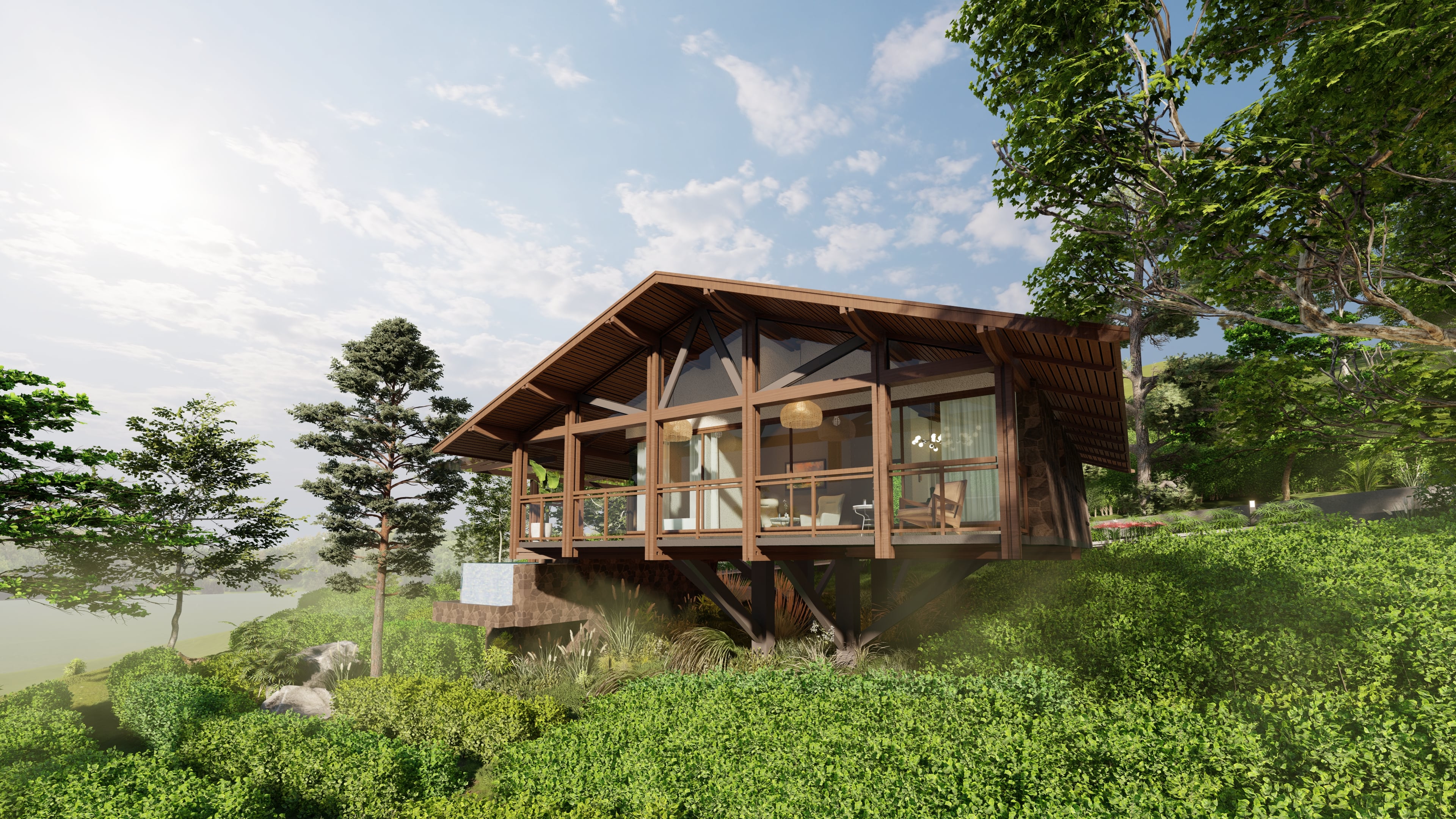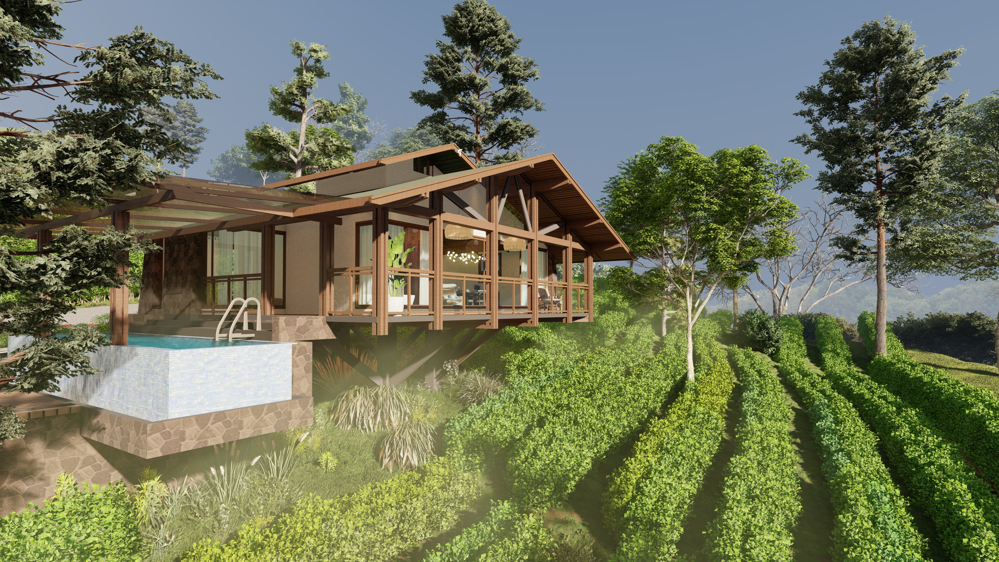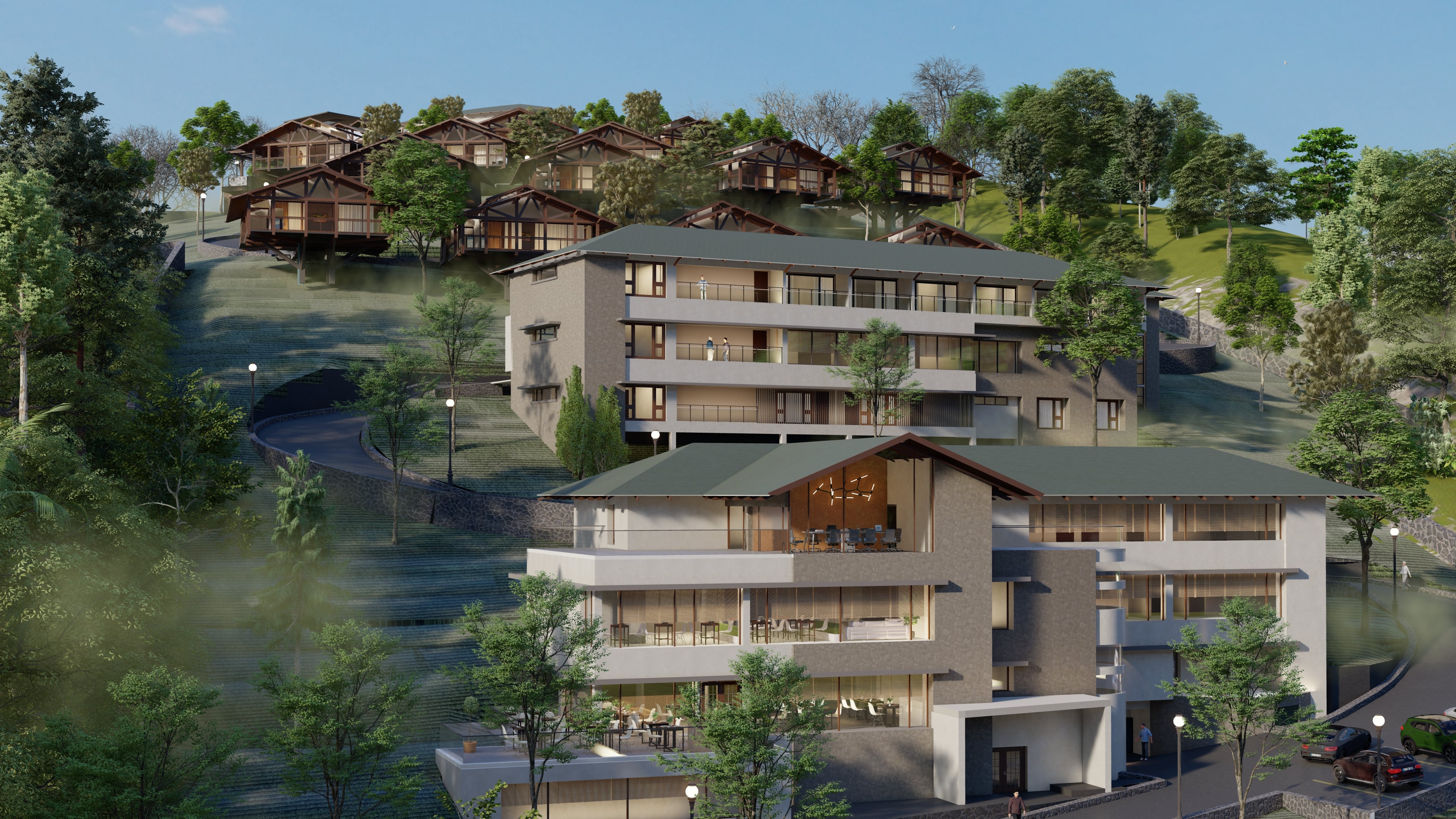 The Sol Orchard is located in the lush greenery of Wagamon mountain ranges of Kerala, covering 15 acres of land ranging from an altitude of 3000ft above the sea level. Spaces are interconnected with a safe and secure road network within the property abiding by all the statutory norms and regulations. This property offers unhindered and aesthetic views which is achieved by strategically positioning each individual block. The usage of stilts for all cottages enhances the sustainability factor by minimizing the disturbance of the existing topography which majorly comprises of tea plantations.